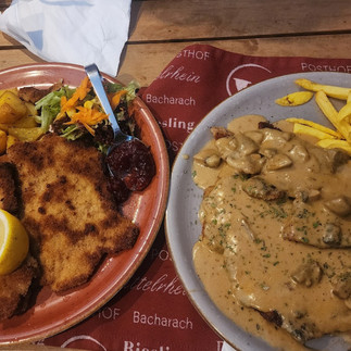 Así, tras una rápida recorrida por el centro al caer la tarde, cenamos en Post Hof (Antigua Oficina de Correos) con vista a la Wernerkapelle iluminada. Optamos por una cena típica alemana, acompañada, como es debido, por unas copas del Riesling local.